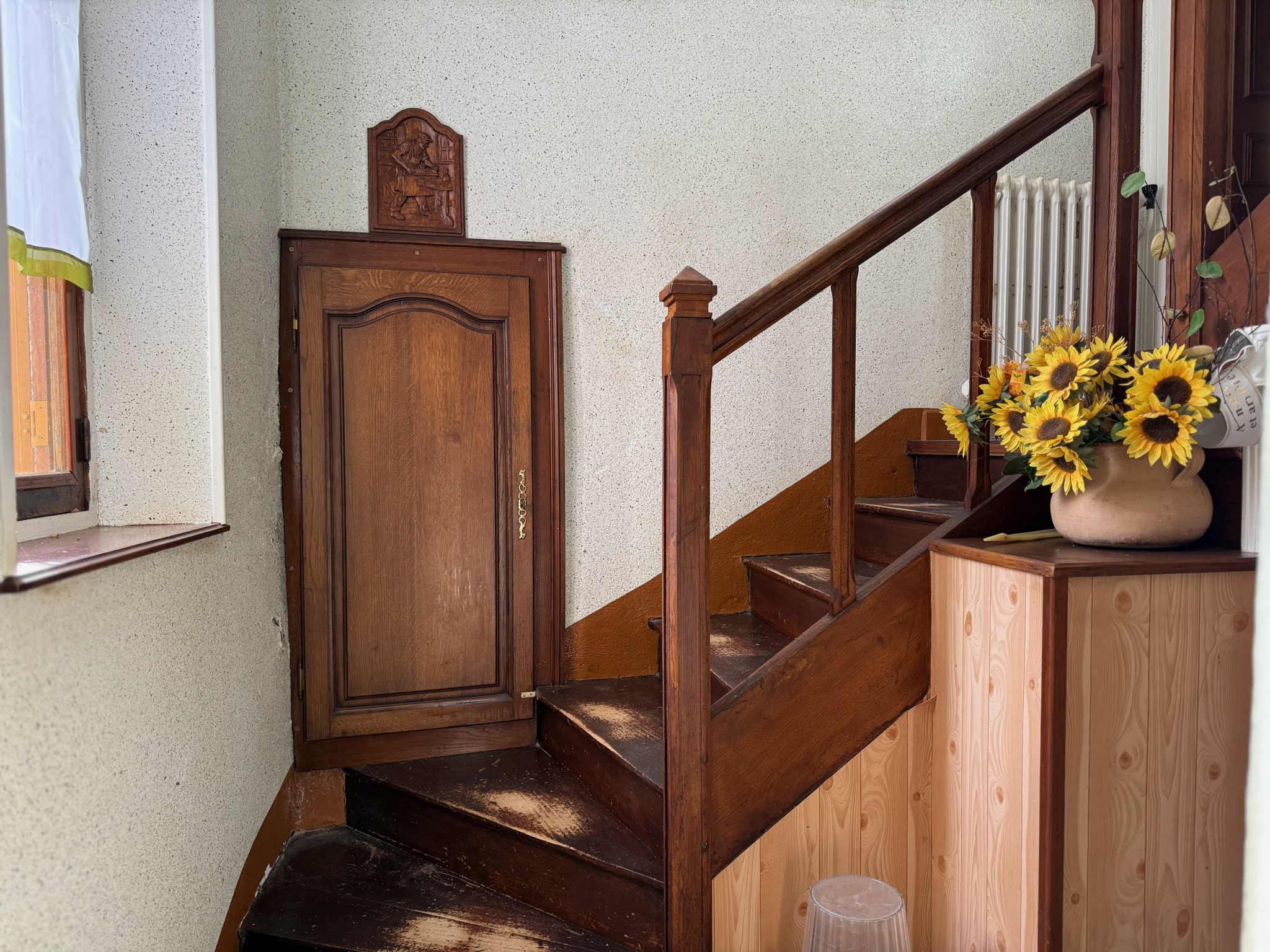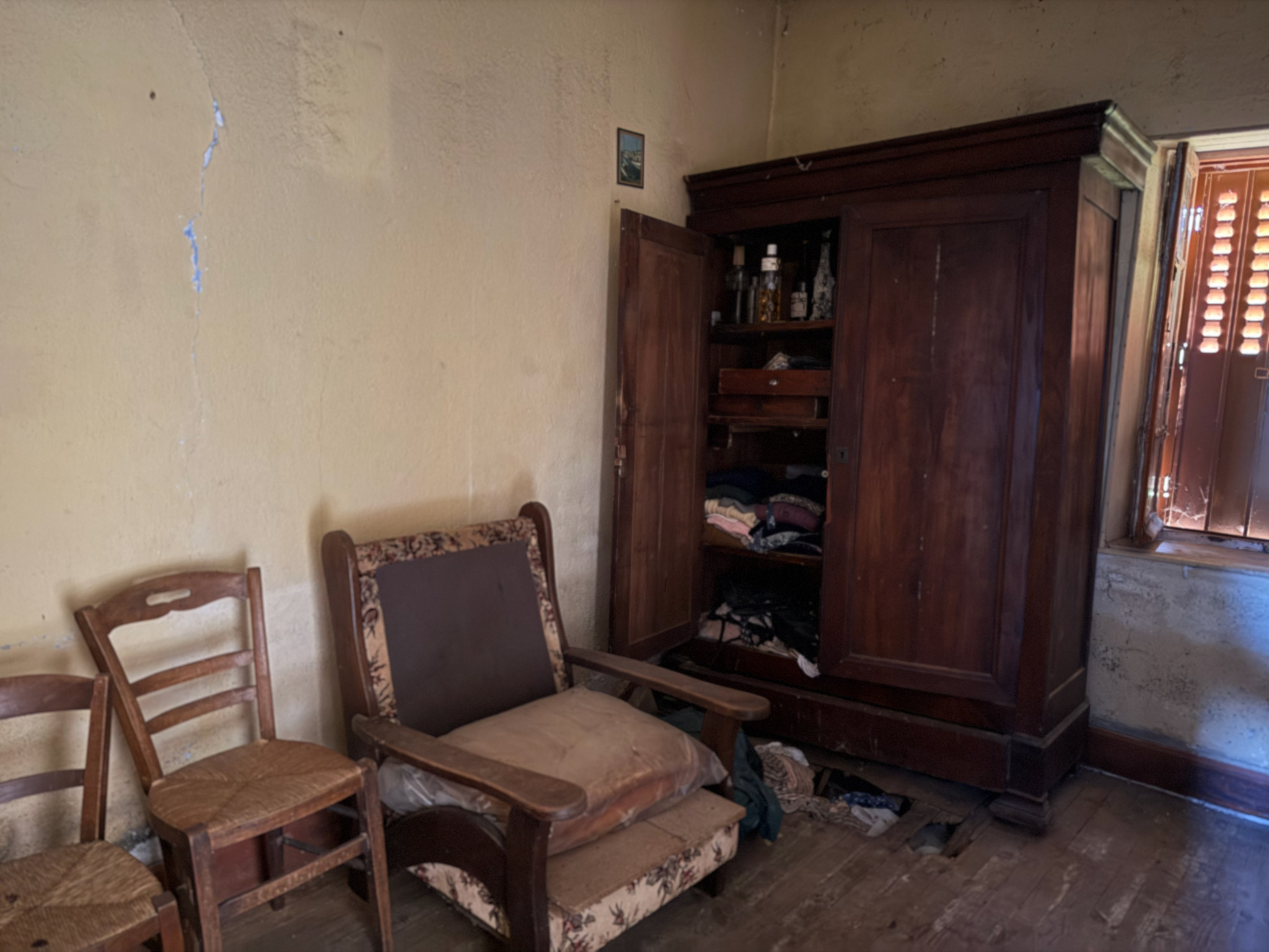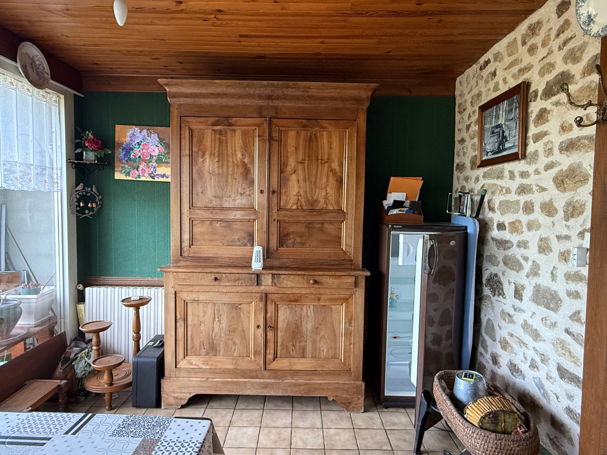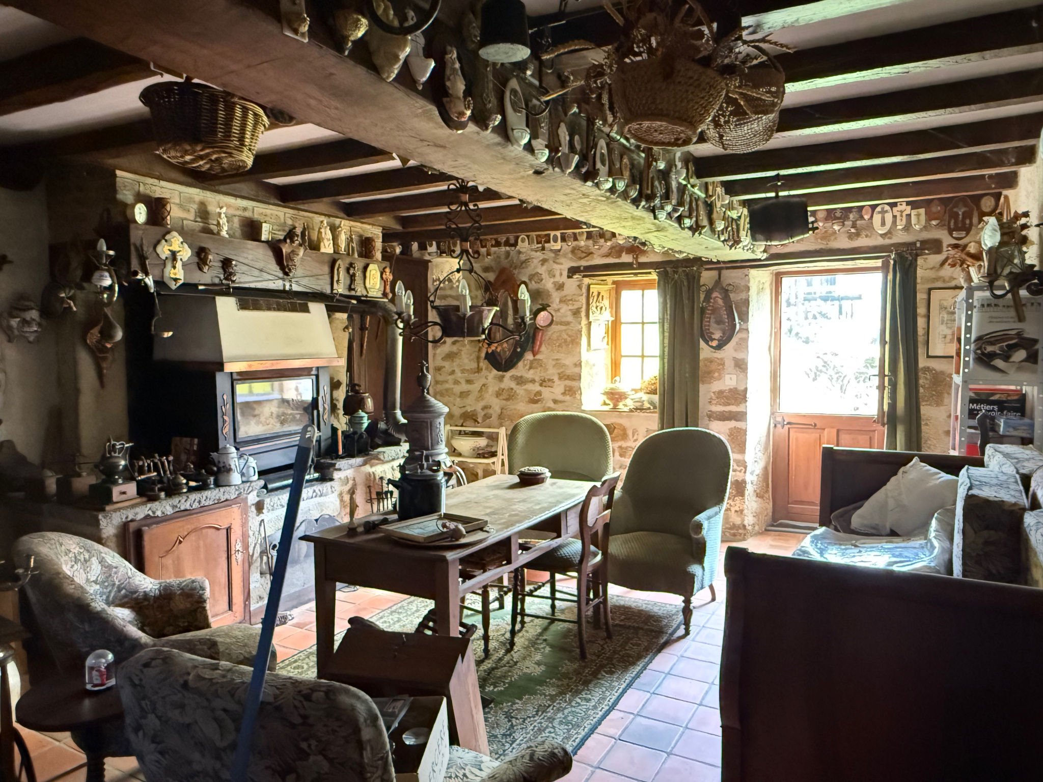 Auv 1196 : 3 maisons mitoyennes, divers bâtiments annexes, 3180m²Cet ensemble offre de très nombreuses possibilités pour divers projets. La maison d’habitation est un peu datée mais on peut y vivre immédiatement tout en la modernisant et en développant un projet. Les ruelles qui divisent l’ensemble en trois grandes parties sont locales et donc presque dépourvues de circulation. La vue à l’ouest, à l’arrière où se trouvent également les jardins, est absolument magnifique : 180° sur la belle région des Combrailles, sans aucun vis-à-vis.La première partie comprend la maison principale qui occupe au rez-de-chaussée en réalité déjà deux maisons, et à droite se trouve encore une troisième maison à rénover. À l’origine, l’ensemble était composé de plusieurs maisons qui ont ensuite été partiellement réunies. Deux d’entre elles forment aujourd’hui un seul ensemble au rez-de-chaussée, tandis qu’une troisième maison, autrefois celle de la grand-mère, reste à rénover.La deuxième partie est un grand et beau terrain avec des arbres (fruitiers) et les ateliers de l’ancien propriétaire, couvreur et menuisier.La troisième partie comprend encore toute une série de bâtiments, dont trois belles constructions en pierres qui peuvent recevoir une destination d’habitation, ainsi que d’autres ateliers. Possibilités donc pour des gîtes, une communauté de vie, ou simplement habiter avec de nombreuses dépendances : les options sont multiples.La maison de gauche dispose d’une petite véranda et d’un hall d’entrée avec cloisons. À gauche se trouvent la cuisine et l’arrière-cuisine, où subsiste le charme d’aménagements plus anciens et où un chauffe-eau à gaz fournit l’eau chaude. À l’arrière se trouve une salle à manger d’origine. La séparation entre cuisine, arrière-cuisine et salle à manger a été réalisée par des cloisons légères. Derrière se trouve une véranda ajoutée. Cette pièce lumineuse sert aujourd’hui de coin salon et s’ouvre, par quelques marches, sur une terrasse puis sur le jardin. Dans le jardin se trouvent quelques petites dépendances ainsi qu’un puits, le tout avec une belle vue. Sol carrelé et murs en pierres joliment rejointoyés.Dans le hall de la maison, on trouve un très grand séjour avec un plafond lambrissé chic. À l’arrière de cette pièce, un espace extérieur utilisé comme serre doit être rénové. C’est également là que se trouve la cuve à fioul. Au rez-de-chaussée, il y a aussi une salle d’eau avec douche, lavabo et toilettes. L’ancien propriétaire était donc menuisier et cela se remarque dans la qualité du bois : un mélange d’éléments authentiques et de réalisations artisanales bien faites.Plus loin, également accessible de l’intérieur mais avec sa propre porte d’entrée, se trouve un séjour d’origine avec cheminée, tomettes, plafond à poutres apparentes et placard intégré. Authentique ! De là part un bel escalier menant à l’étage, où le grenier n’est pas encore aménagé.Depuis la cuisine, on accède aussi à un hall avec cave et escalier. À mi-étage se trouve une salle de bains avec fenêtre, baignoire, wc, lavabo et bidet. Quelques marches plus haut se trouvent deux chambres, dont la chambre arrière avec cette magnifique vue panoramique à 180 degrés sur la nature et pratiquement aucune autre maison proche. Dans l’une des chambres se trouve un placard intégré, dans l’autre, de grandes fenêtres, des finitions en bois et un plancher en bois apportent du caractère, complétés par un autre grand placard et une cloison qui permettrait d’aménager une salle d’eau attenante ou d’agrandir la pièce.Le chauffage se fait par une ancienne installation de chauffage au fioul et un poêle à bois.La maison à rénover, située à droite, n’est pas comprise dans la surface habitable. Les dépendances évidemment non plus. Cette maison dispose d’un escalier central et de deux pièces à gauche et à droite, tant au rez-de-chaussée qu’à l’étage. Bien que la toiture contienne de l’amiante, la construction générale est solide, ce qui permet une rénovation facile. Elle dispose de son propre compteur électrique (modèle ancien). À l’intérieur, on trouve des parquets et une cheminée. La pièce de droite au rez-de-chaussée est divisée par une cloison. À l’arrière, cette maison offre également la même belle vue.Il est difficile de tout décrire tant il y a de choses. Les possibilités de ce beau projet sont donc immenses.