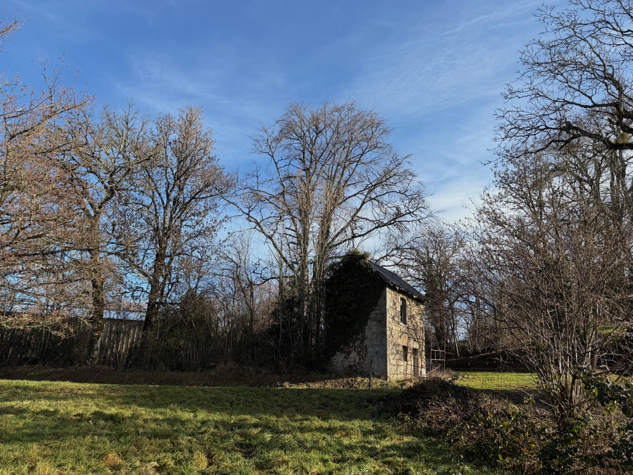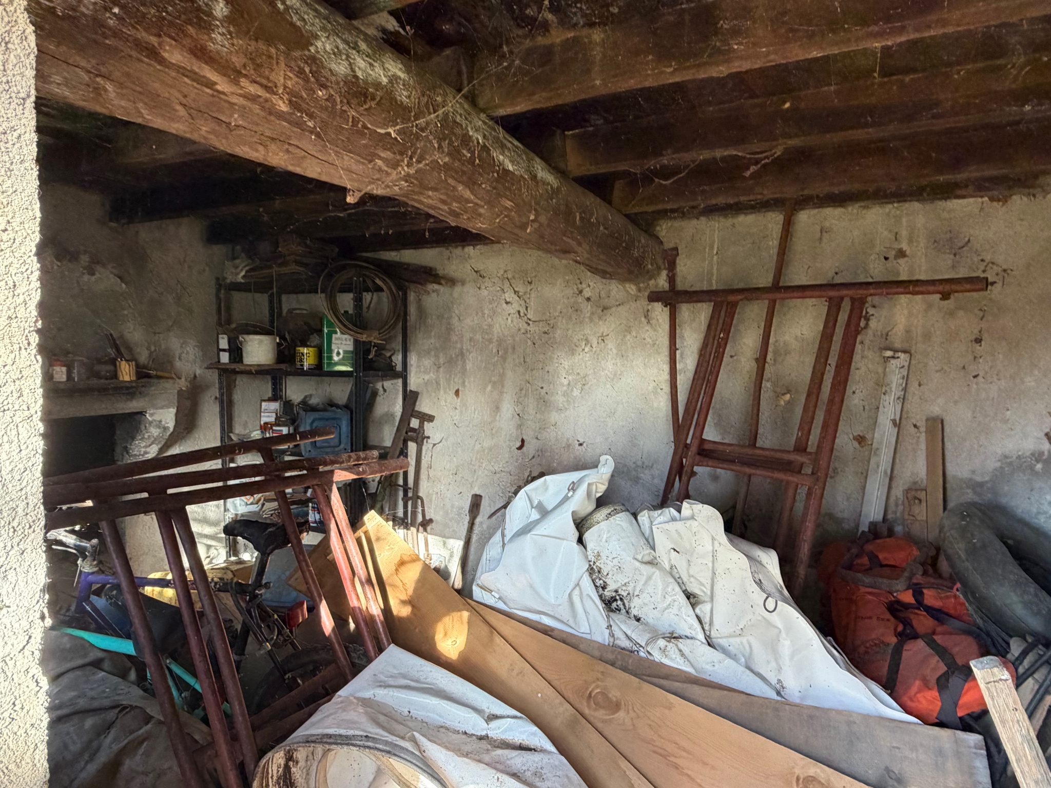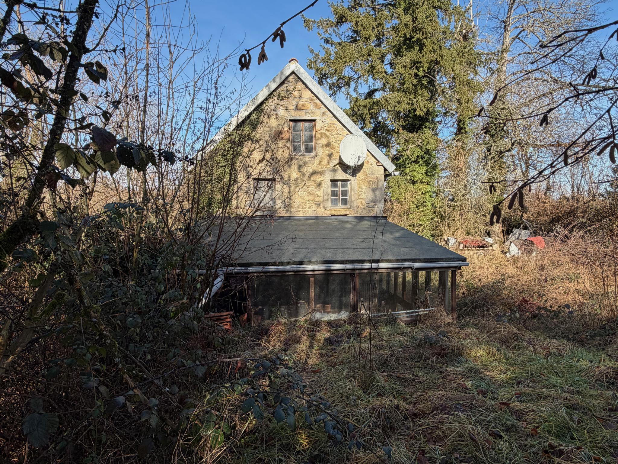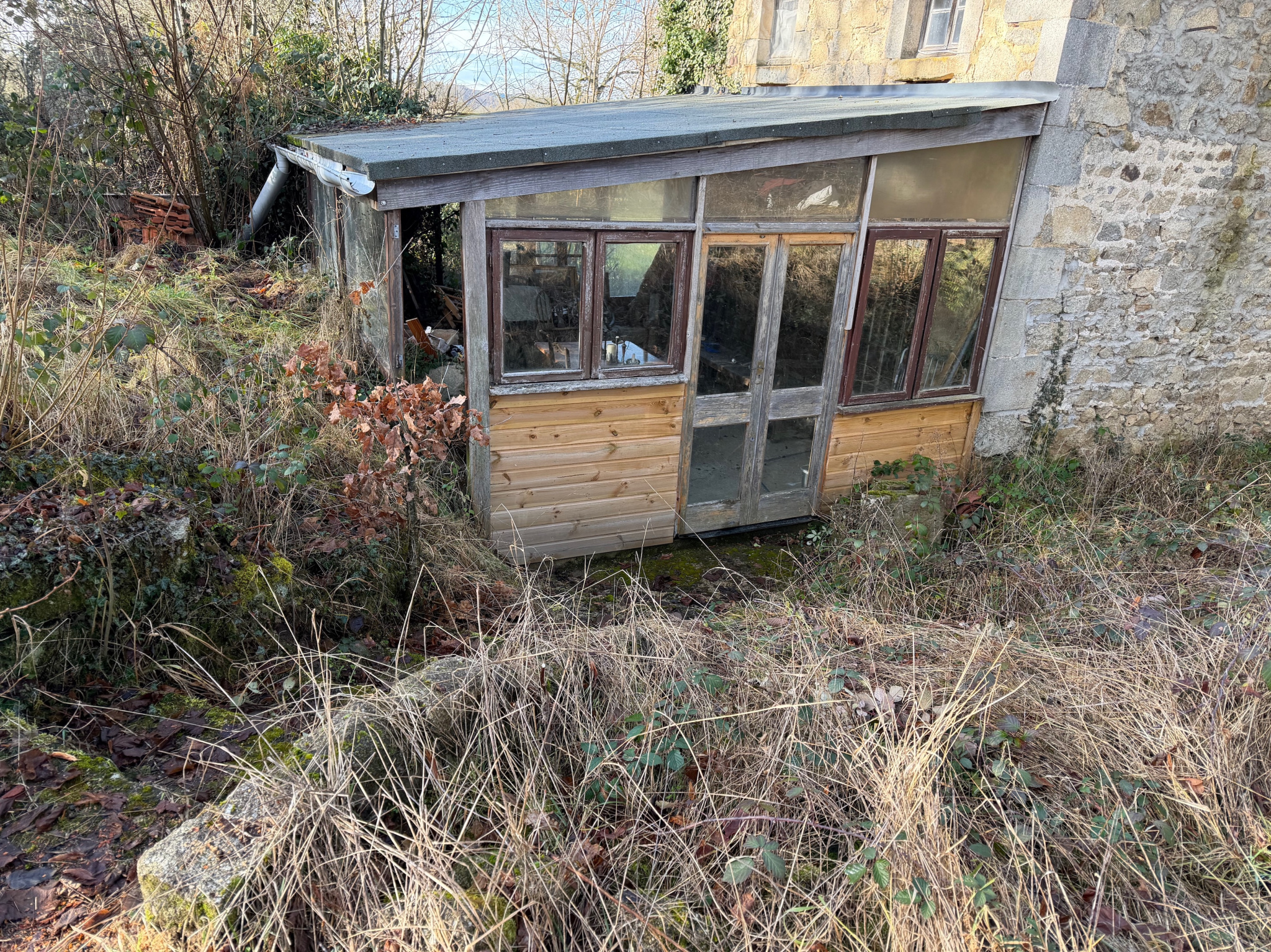 Auv 1209 : Charmante maisonnette, véranda, 2ème maison, ruine, terrainCet ensemble se compose de trois petits bâtiments distincts : une petite maison habitable, une maisonnette à rénover et une ruine, chacun avec un jardin, ainsi qu’une parcelle de terrain séparée susceptible d’être constructible.La maisonnette habitable est située de façon légèrement dissimulée dans un bosquet, sans vis-à-vis. Devant la maison se trouve une véranda d’environ 15m² donnant sur le jardin.Dans la maison en pierres se trouvent la cuisine et le séjour, réunis en une seule pièce ouverte d’une superficie de 21m², avec une hauteur sous poutres de 2m. Cette pièce est équipée d’un poêle à bois et d’une cuisine récente entièrement intégrée.Au premier étage se trouve une chambre de 11m² avec une salle d’eau en suite de 5m², équipée d’un lavabo, d’une douche, de toilettes et d’un placard intégré. La hauteur sous plafond à cet étage est légèrement inférieure à 2m.Au-dessus de cet étage se trouve un niveau de combles aménagés, pouvant servir d’espace de couchage supplémentaire ou de pièce polyvalente. Cet espace présente des murs mansardés et une hauteur maximale d’ 1m90. Attenante se trouve une deuxième salle de bains en suite de 4,5m², équipée d’une baignoire, d’un lavabo et de toilettes.La maison habitable dispose d’une fosse toutes eaux mais non conforme.La deuxième maisonnette, située côté rue, a une surface intérieure de 20m² et est entièrement à rénover, tant au rez-de-chaussée qu’au premier étage.La toiture est fortement endommagée et doit être entièrement refaite.Cette maisonnette dispose également de sa propre fosse septique non conforme.Le troisième bâtiment en pierres est une ruine avec une surface intérieure d’environ 10m². Elle dispose d’une charmante petite cheminée en pierres. Il y a également un étage.La parcelle supplémentaire est située entre deux maisons existantes et est donc probablement constructible. Dans cette région, chaque projet doit faire l’objet d’une demande distincte, il n’existe pas de règles de construction fixes.Bel ensemble, n’hésitez pas à demander un plan cadastral afin de voir précisément comment les bâtiments sont situés les uns par rapport aux autres.Nous avons également la maison voisine à vendre sous la référence Auv 1193. Une combinaison pourrait être intéressante.