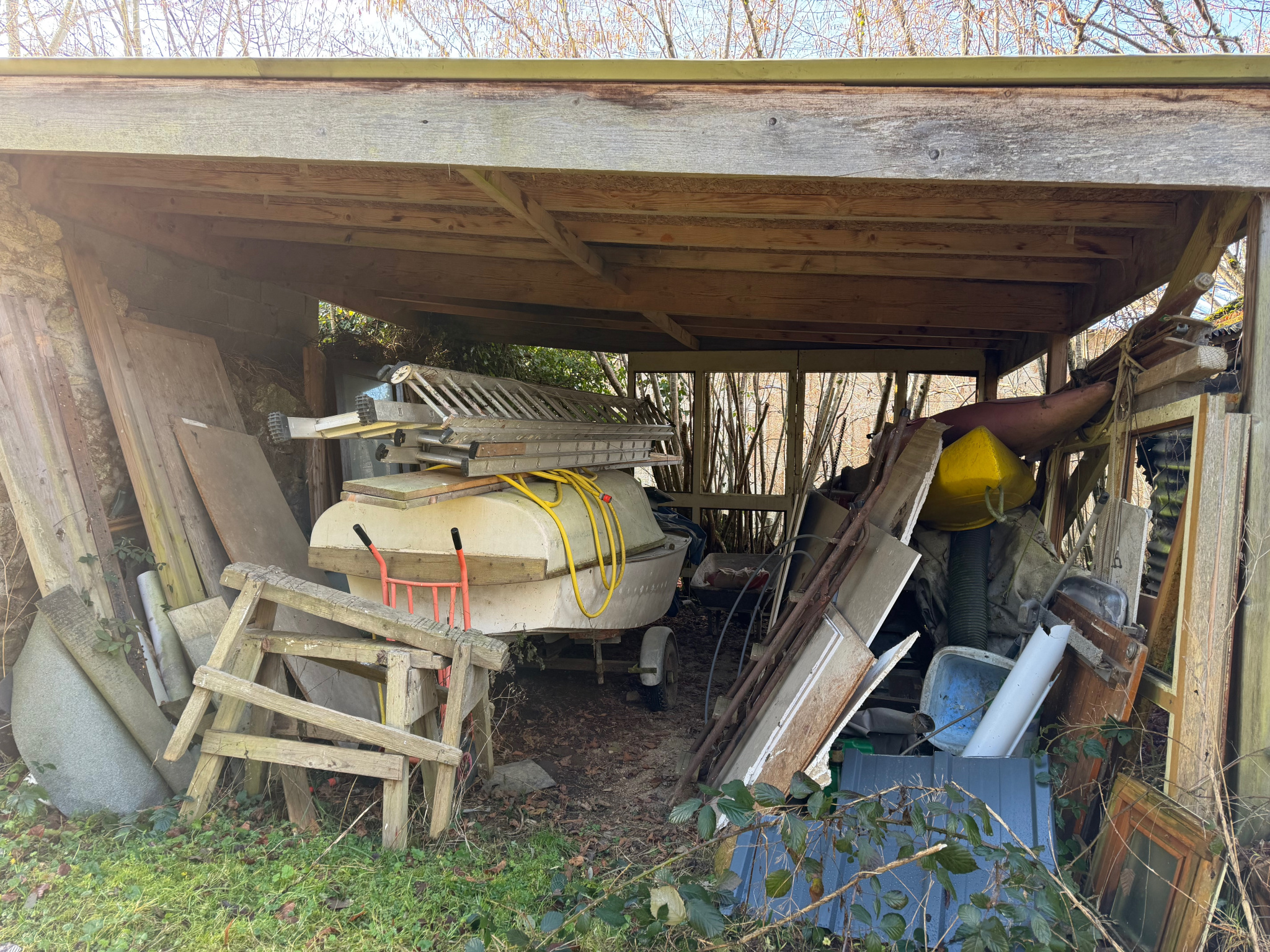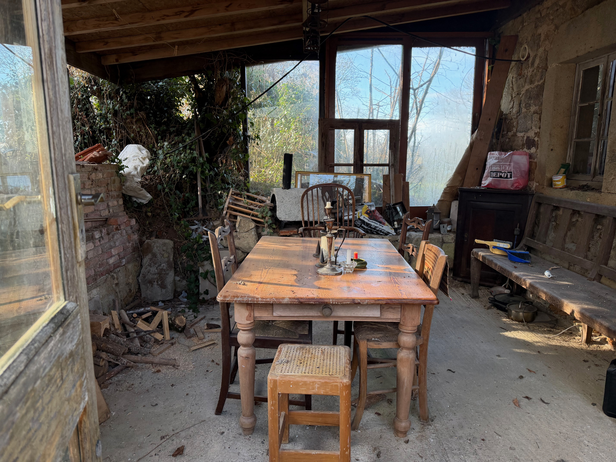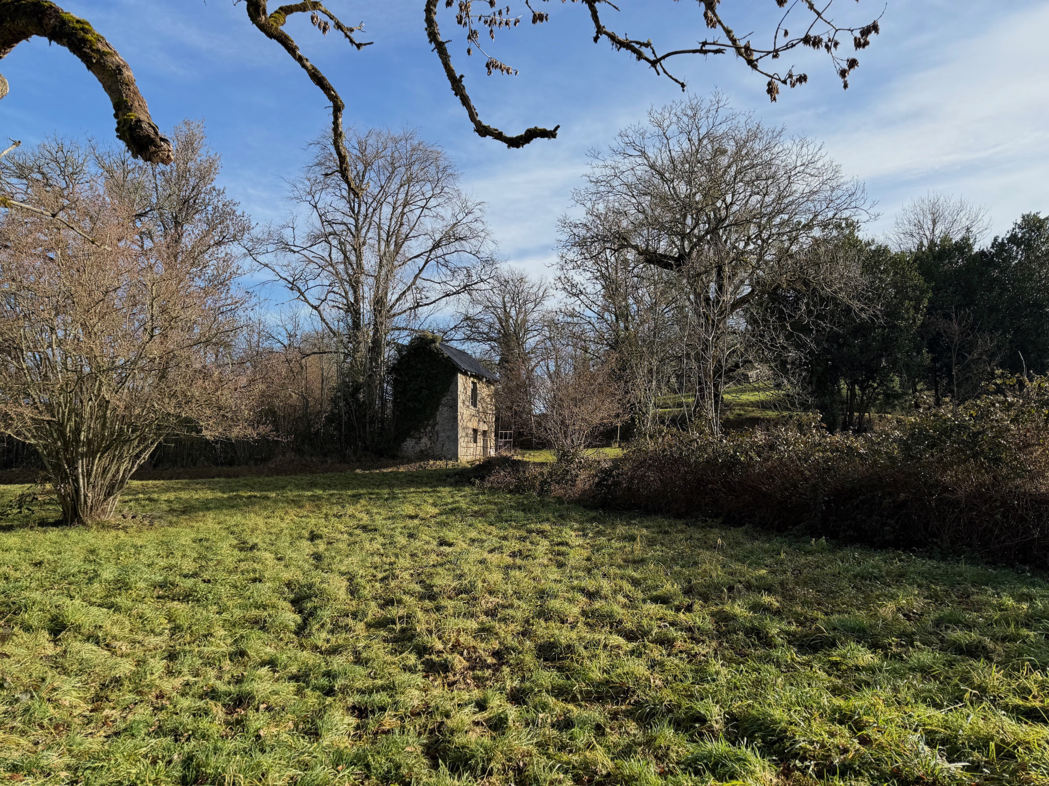 Auv 1209 : Charmante maisonnette, véranda, 2ème maison, ruine, terrainCet ensemble se compose de trois petits bâtiments distincts : une petite maison habitable, une maisonnette à rénover et une ruine, chacun avec un jardin, ainsi qu’une parcelle de terrain séparée susceptible d’être constructible.La maisonnette habitable est située de façon légèrement dissimulée dans un bosquet, sans vis-à-vis. Devant la maison se trouve une véranda d’environ 15m² donnant sur le jardin.Dans la maison en pierres se trouvent la cuisine et le séjour, réunis en une seule pièce ouverte d’une superficie de 21m², avec une hauteur sous poutres de 2m. Cette pièce est équipée d’un poêle à bois et d’une cuisine récente entièrement intégrée.Au premier étage se trouve une chambre de 11m² avec une salle d’eau en suite de 5m², équipée d’un lavabo, d’une douche, de toilettes et d’un placard intégré. La hauteur sous plafond à cet étage est légèrement inférieure à 2m.Au-dessus de cet étage se trouve un niveau de combles aménagés, pouvant servir d’espace de couchage supplémentaire ou de pièce polyvalente. Cet espace présente des murs mansardés et une hauteur maximale d’ 1m90. Attenante se trouve une deuxième salle de bains en suite de 4,5m², équipée d’une baignoire, d’un lavabo et de toilettes.La maison habitable dispose d’une fosse toutes eaux mais non conforme.La deuxième maisonnette, située côté rue, a une surface intérieure de 20m² et est entièrement à rénover, tant au rez-de-chaussée qu’au premier étage.La toiture est fortement endommagée et doit être entièrement refaite.Cette maisonnette dispose également de sa propre fosse septique non conforme.Le troisième bâtiment en pierres est une ruine avec une surface intérieure d’environ 10m². Elle dispose d’une charmante petite cheminée en pierres. Il y a également un étage.La parcelle supplémentaire est située entre deux maisons existantes et est donc probablement constructible. Dans cette région, chaque projet doit faire l’objet d’une demande distincte, il n’existe pas de règles de construction fixes.Bel ensemble, n’hésitez pas à demander un plan cadastral afin de voir précisément comment les bâtiments sont situés les uns par rapport aux autres.Nous avons également la maison voisine à vendre sous la référence Auv 1193. Une combinaison pourrait être intéressante.