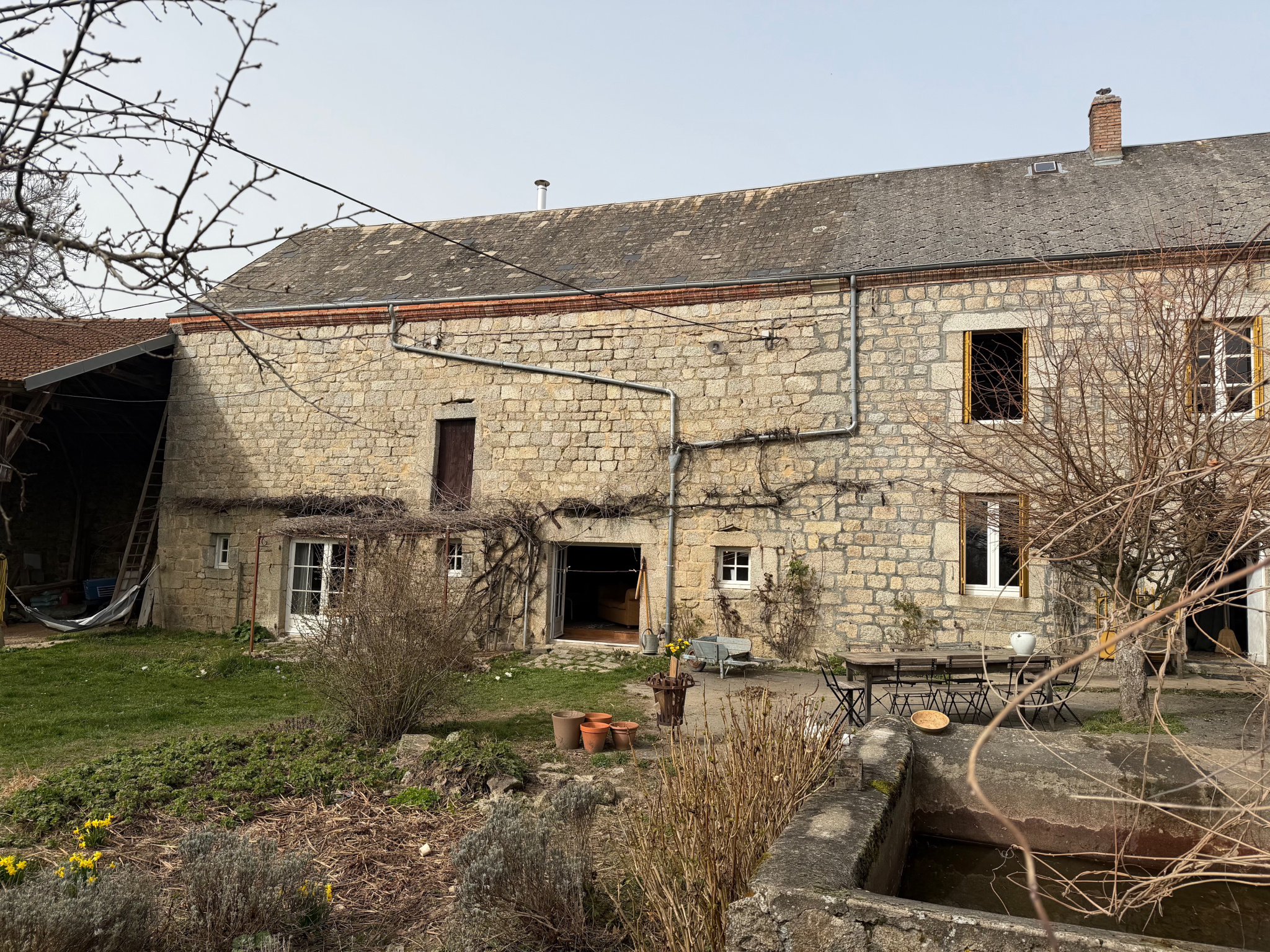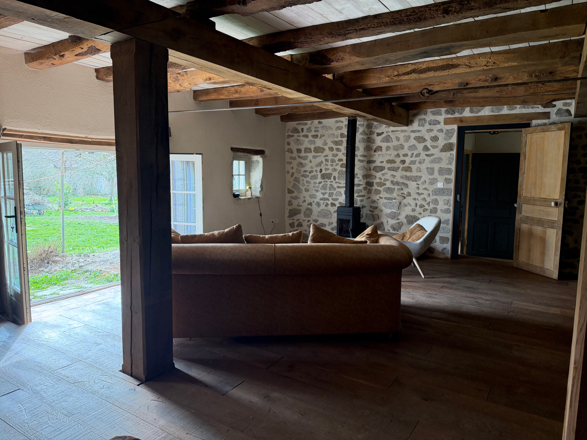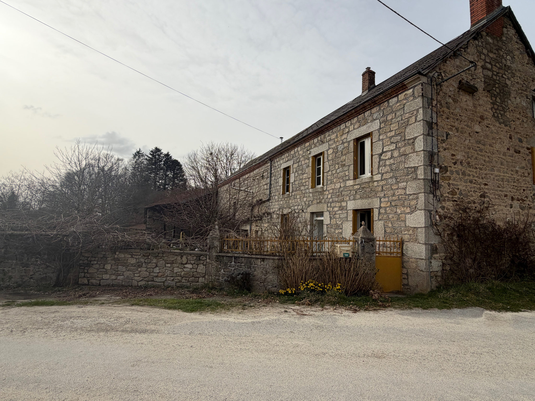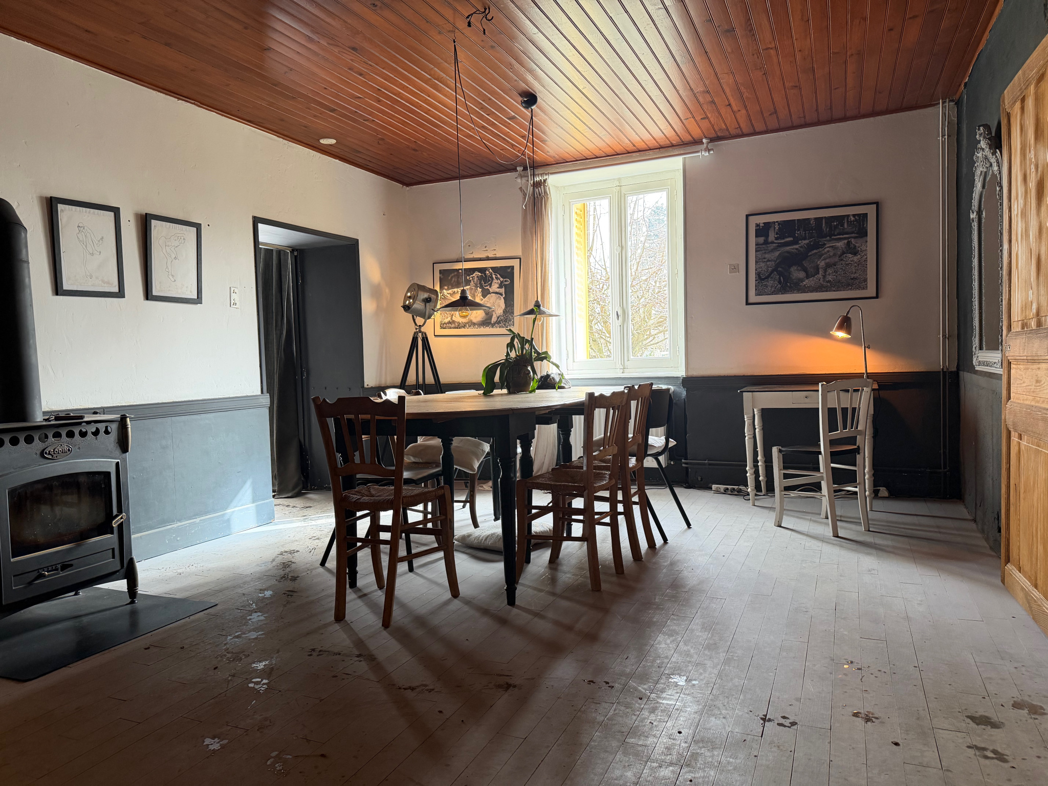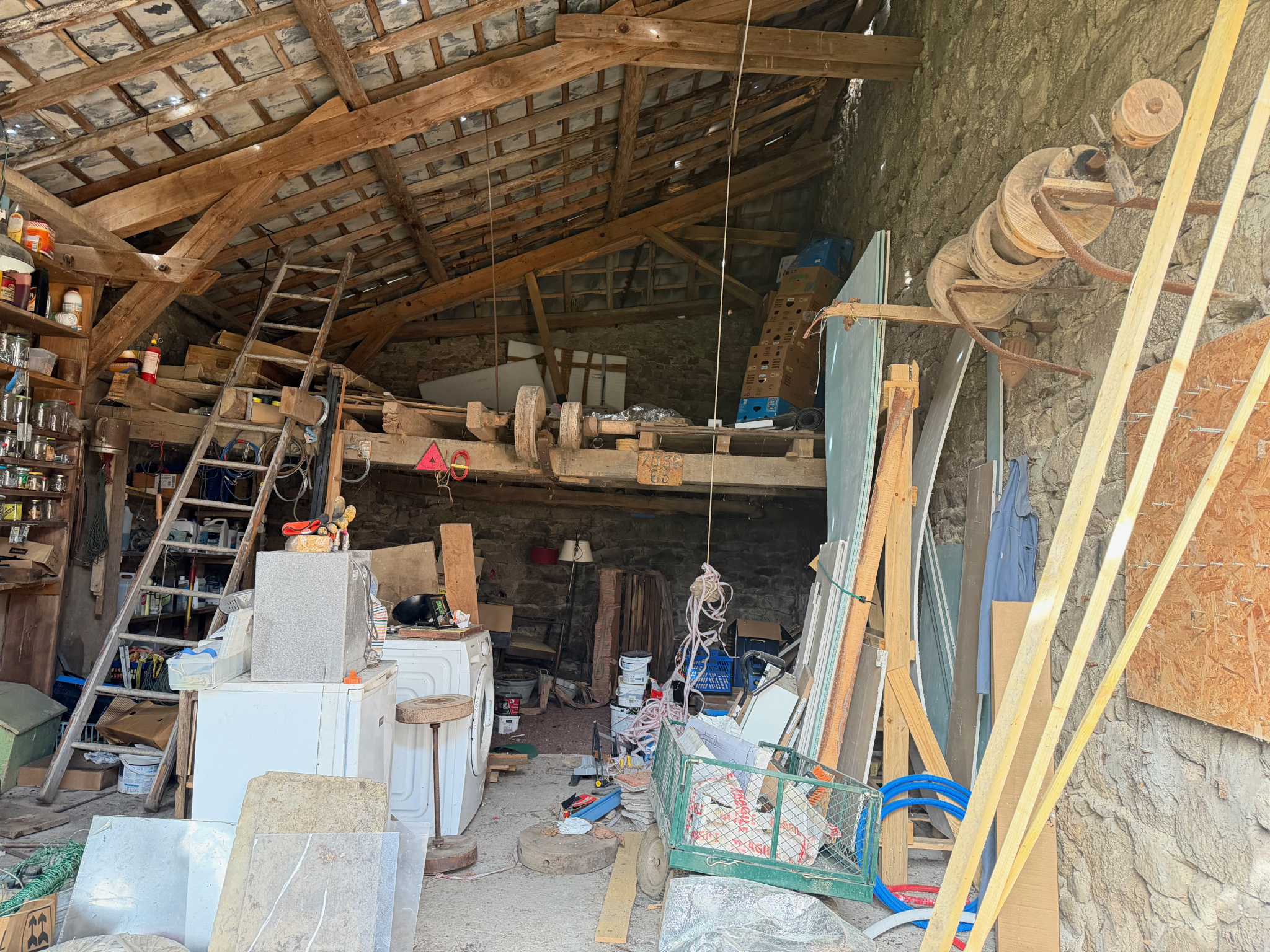 Auv 1215 : Maison en magnifiques pierres, dépendances et jardin.La maison a été entièrement rénovée avec beaucoup d’attention portée aux détails authentiques. Poutres apparentes, murs en pierres naturelles jontés, superbe plancher en bois dans le séjour, etc. La plupart des fenêtres sont en double vitrage, mais pas toutes.Toute la maison est équipée d’un chauffage central au fioul.Au milieu de la maison se trouve une superbe pièce de vie de 51m². C’est le cœur de la maison, avec un beau plancher en larges lames de chêne, un poêle à bois et des portes doubles donnant sur le jardin. Entre les poutres, la hauteur sous plafond est d’environ 2m50. Magnifique bibliothèque.La salle à manger fait 27m² et dispose également d’un poêle à bois, d’un parquet en chêne et d’un plafond habillé de bois.La cuisine équipée mesure 23m² et possède une belle ancienne cheminée ainsi qu’un poêle à bois, un sol carrelé et un plafond en bois peint en blanc. Derrière la cuisine se trouve un espace de rangement avec machine à laver et réfrigérateur, ainsi qu’un toilette supplémentaire.C’est également ici que se trouve l’accès à la cave de 28m² avec la cuve à fioul et la chaudière du chauffage central.Au rez-de-chaussée, il y a une première chambre de 13,5m² avec d’agréables portes doubles donnant sur le jardin. Plafond en bois, beaux planchers et salle de bains en suite. La magnifique salle de bains de 8m² comprend une douche à l’italienne, une baignoire en fonte sur pieds, un toilette et un beau meuble lavabo.Il y a également une pièce de 5m², idéale pour installer machine à laver et sèche-linge.Au premier étage se trouvent encore trois chambres agréables de 19,5, 12 et 9,5m². Il y a aussi une jolie salle d’eau (5m²) avec douche, toilette et lavabo.Il y a également un palier spacieux à l’étage de 12m², escalier compris. Cet étage est lui aussi chauffé par le chauffage central. Il y a encore un double grenier (surfaces au sol de 36 et 28m²) qui pourrait être aménagé. La toiture du grenier n’est pas isolée, mais le plancher entre le grenier et les chambres l’est.Le jardin est très joliment aménagé, avec une table pour manger et plusieurs coins salon agréables. On y trouve également de belles plantations. Le long de la façade, une pergola a été installée sous laquelle on peut s’asseoir.Il y a ensuite plusieurs dépendances attenantes. Tout d’abord un grand auvent d’environ 85m².Dans la continuité se trouve un espace de grange sous toit en pente de 46m² avec une toiture en moins bon état. À côté se trouve encore un petit auvent de 13m².Il y a aussi un abri en bois récemment construit de 32m². Il serait pratique d’y créer un passage afin de pouvoir entrer en voiture depuis le petit chemin situé à l’arrière.Sur le côté de la maison se trouve un magnifique mur en pierres naturelles avec un portillon piéton.Il y a également un grand espace de grange, accessible par la grande porte située à l’arrière du bâtiment, le long du petit chemin. Cet espace de grange ou d’atelier mesure environ 88,5m². Le point le plus haut du toit atteint 6,2 mètres.Très belle maison agréable.