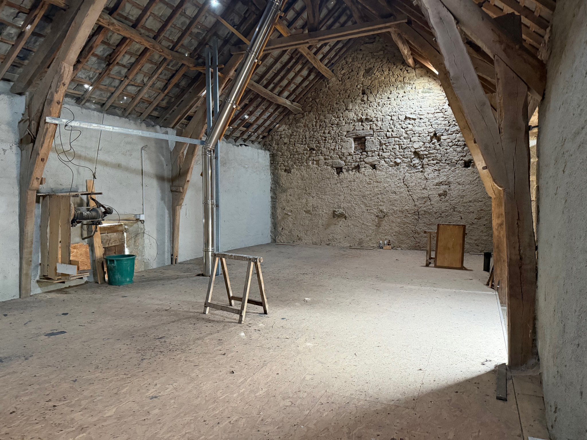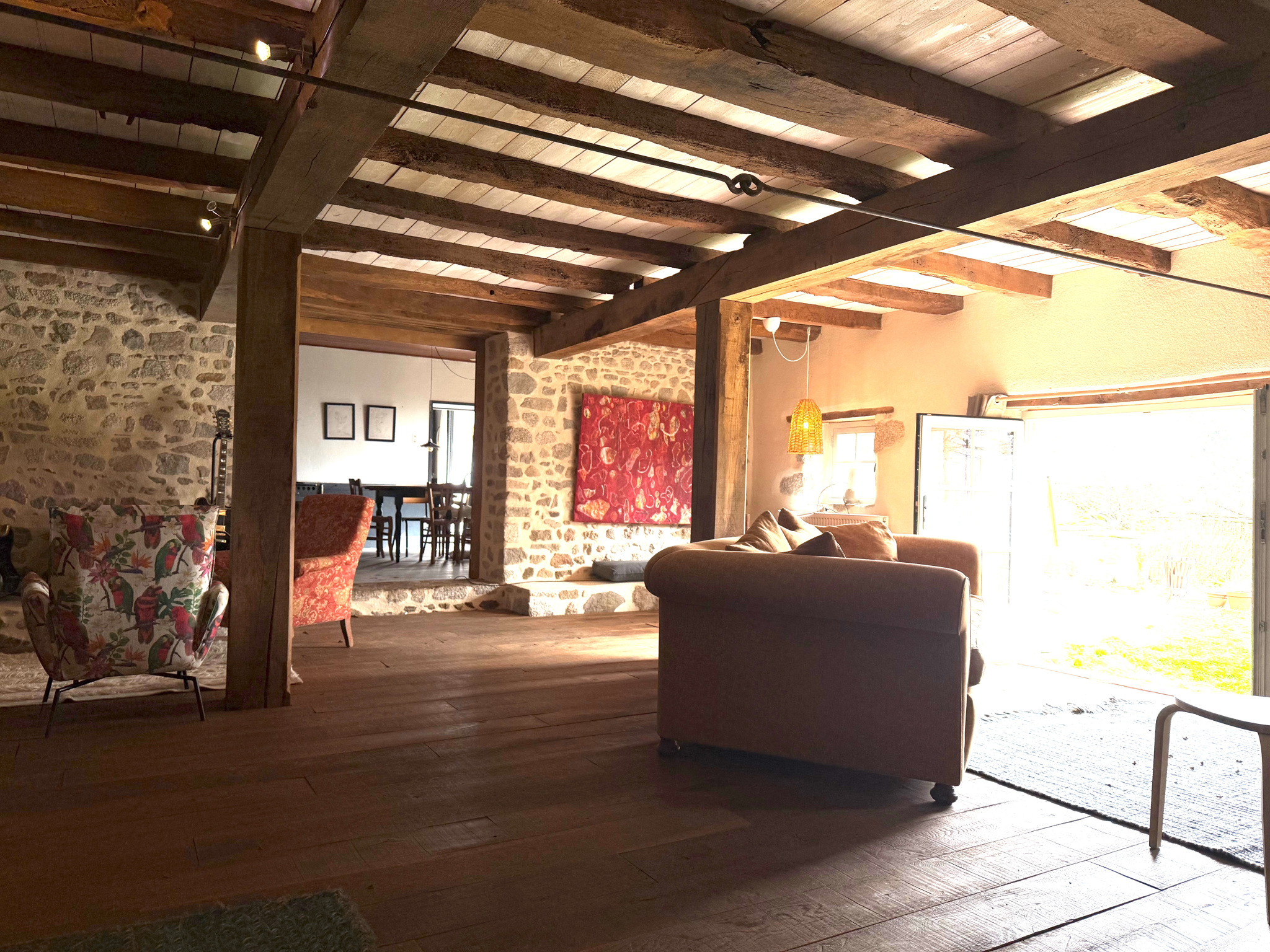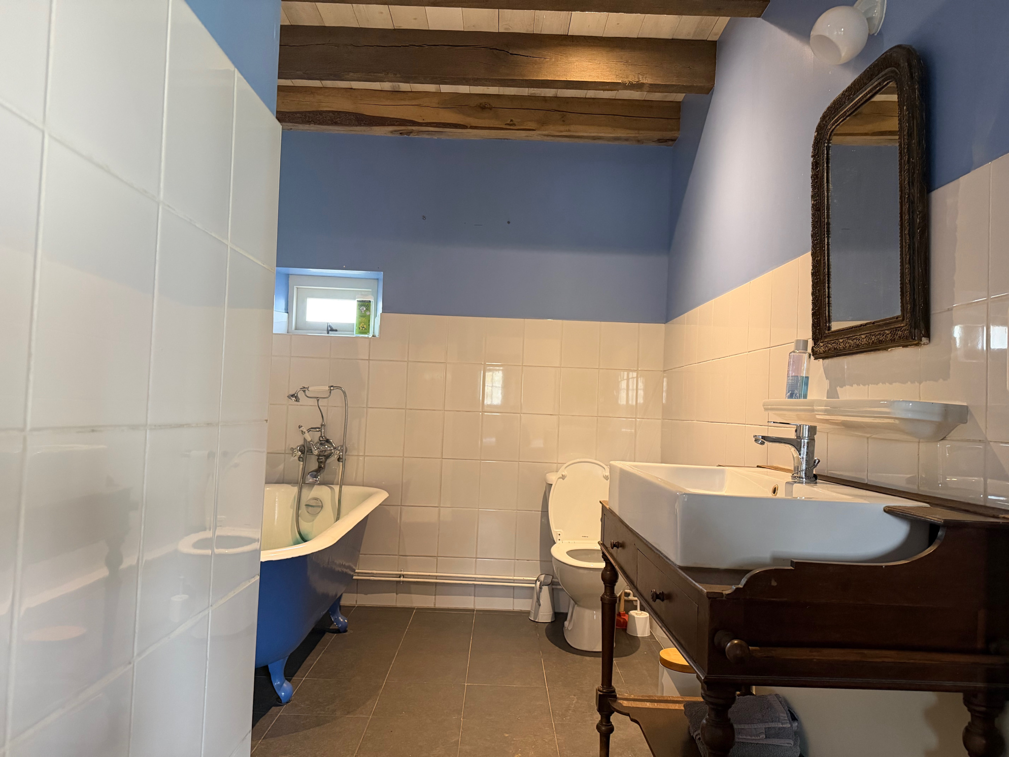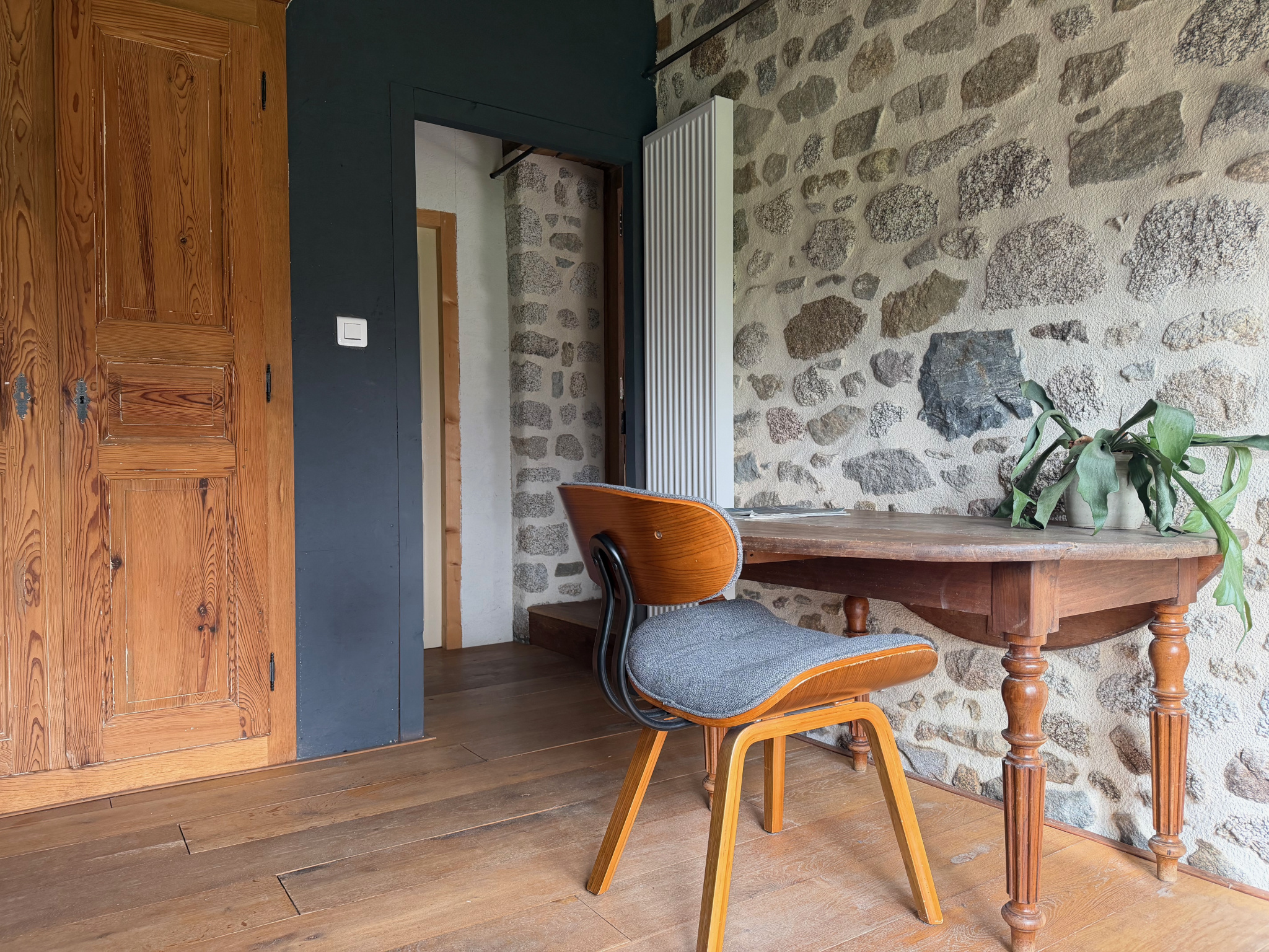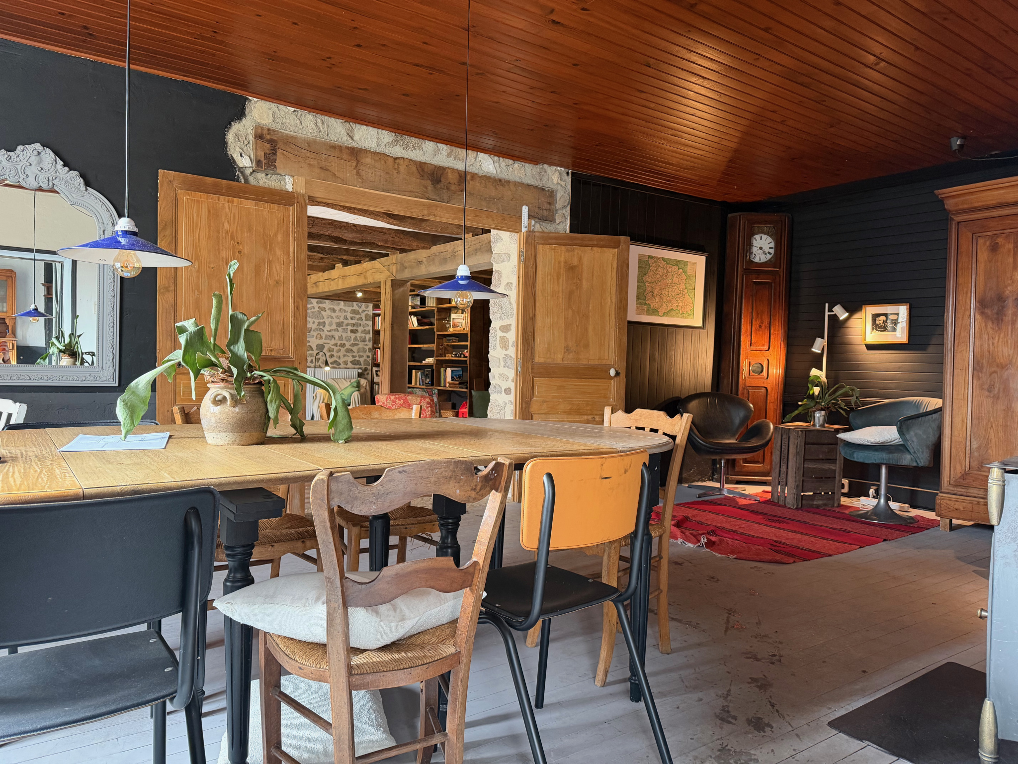 Auv 1215 : Maison en magnifiques pierres, dépendances et jardin.La maison a été entièrement rénovée avec beaucoup d’attention portée aux détails authentiques. Poutres apparentes, murs en pierres naturelles jontés, superbe plancher en bois dans le séjour, etc. La plupart des fenêtres sont en double vitrage, mais pas toutes.Toute la maison est équipée d’un chauffage central au fioul.Au milieu de la maison se trouve une superbe pièce de vie de 51m². C’est le cœur de la maison, avec un beau plancher en larges lames de chêne, un poêle à bois et des portes doubles donnant sur le jardin. Entre les poutres, la hauteur sous plafond est d’environ 2m50. Magnifique bibliothèque.La salle à manger fait 27m² et dispose également d’un poêle à bois, d’un parquet en chêne et d’un plafond habillé de bois.La cuisine équipée mesure 23m² et possède une belle ancienne cheminée ainsi qu’un poêle à bois, un sol carrelé et un plafond en bois peint en blanc. Derrière la cuisine se trouve un espace de rangement avec machine à laver et réfrigérateur, ainsi qu’un toilette supplémentaire.C’est également ici que se trouve l’accès à la cave de 28m² avec la cuve à fioul et la chaudière du chauffage central.Au rez-de-chaussée, il y a une première chambre de 13,5m² avec d’agréables portes doubles donnant sur le jardin. Plafond en bois, beaux planchers et salle de bains en suite. La magnifique salle de bains de 8m² comprend une douche à l’italienne, une baignoire en fonte sur pieds, un toilette et un beau meuble lavabo.Il y a également une pièce de 5m², idéale pour installer machine à laver et sèche-linge.Au premier étage se trouvent encore trois chambres agréables de 19,5, 12 et 9,5m². Il y a aussi une jolie salle d’eau (5m²) avec douche, toilette et lavabo.Il y a également un palier spacieux à l’étage de 12m², escalier compris. Cet étage est lui aussi chauffé par le chauffage central. Il y a encore un double grenier (surfaces au sol de 36 et 28m²) qui pourrait être aménagé. La toiture du grenier n’est pas isolée, mais le plancher entre le grenier et les chambres l’est.Le jardin est très joliment aménagé, avec une table pour manger et plusieurs coins salon agréables. On y trouve également de belles plantations. Le long de la façade, une pergola a été installée sous laquelle on peut s’asseoir.Il y a ensuite plusieurs dépendances attenantes. Tout d’abord un grand auvent d’environ 85m².Dans la continuité se trouve un espace de grange sous toit en pente de 46m² avec une toiture en moins bon état. À côté se trouve encore un petit auvent de 13m².Il y a aussi un abri en bois récemment construit de 32m². Il serait pratique d’y créer un passage afin de pouvoir entrer en voiture depuis le petit chemin situé à l’arrière.Sur le côté de la maison se trouve un magnifique mur en pierres naturelles avec un portillon piéton.Il y a également un grand espace de grange, accessible par la grande porte située à l’arrière du bâtiment, le long du petit chemin. Cet espace de grange ou d’atelier mesure environ 88,5m². Le point le plus haut du toit atteint 6,2 mètres.Très belle maison agréable.