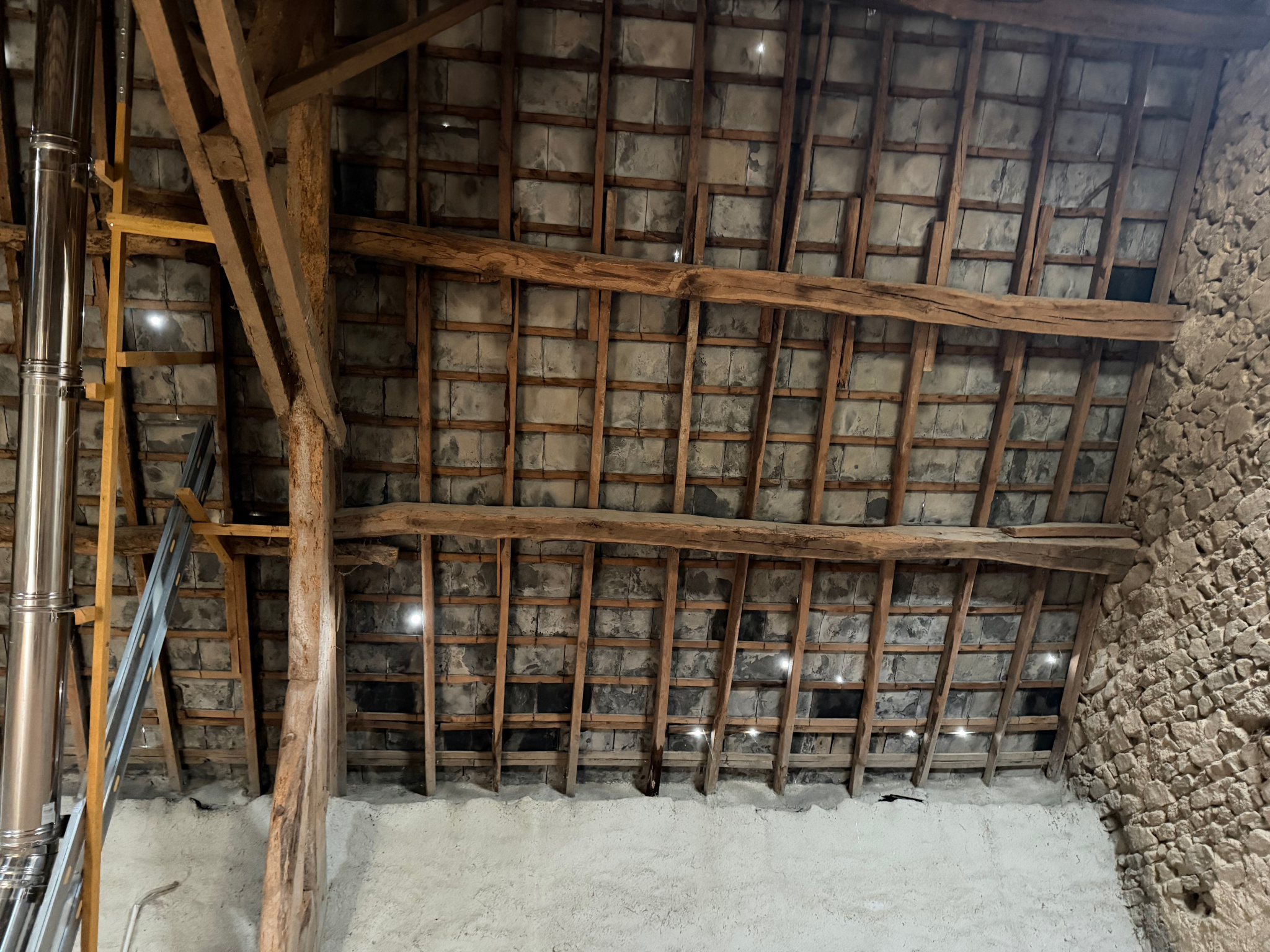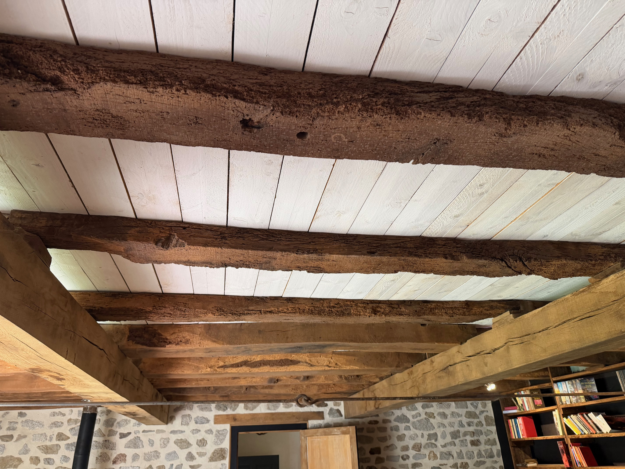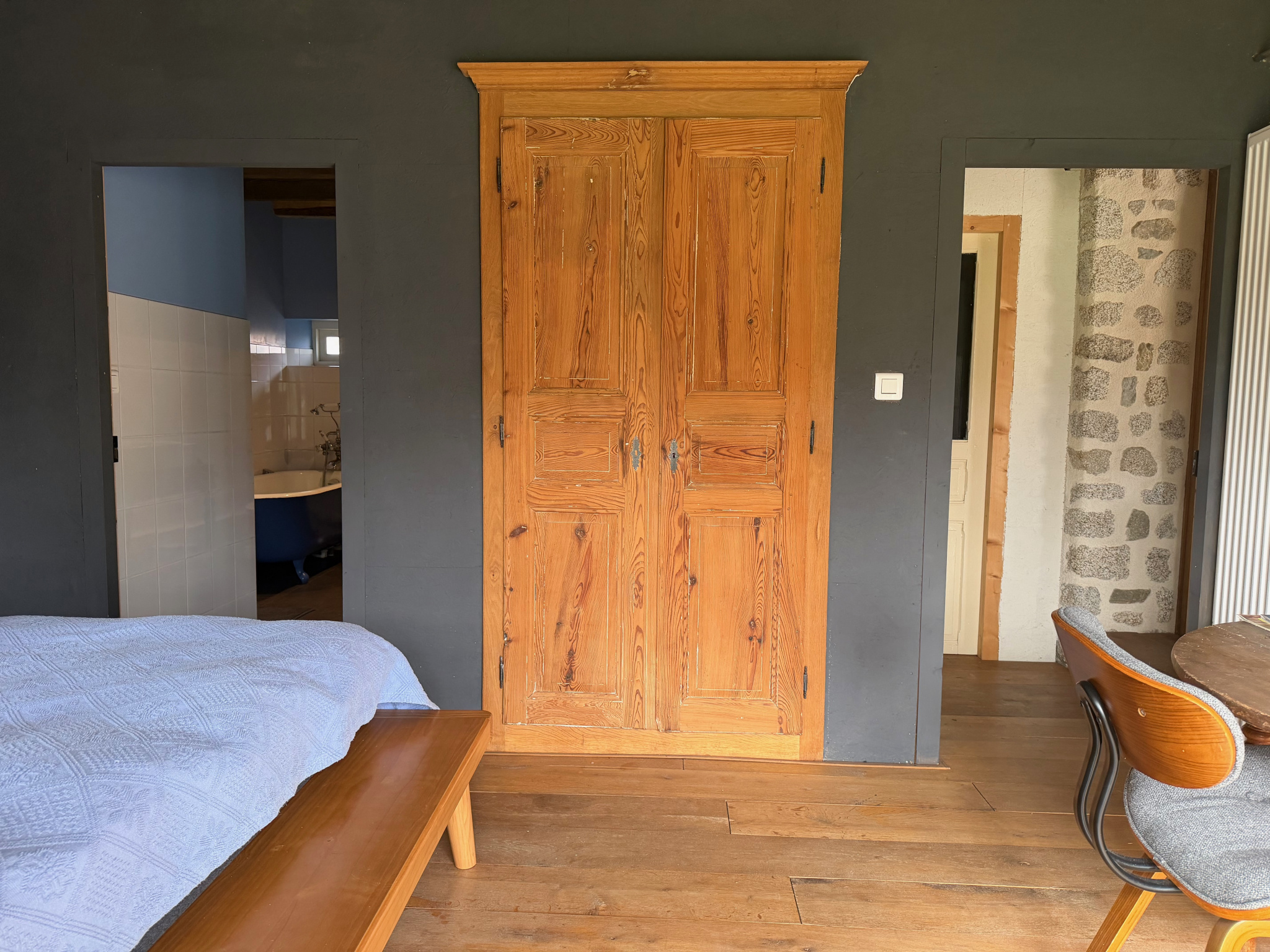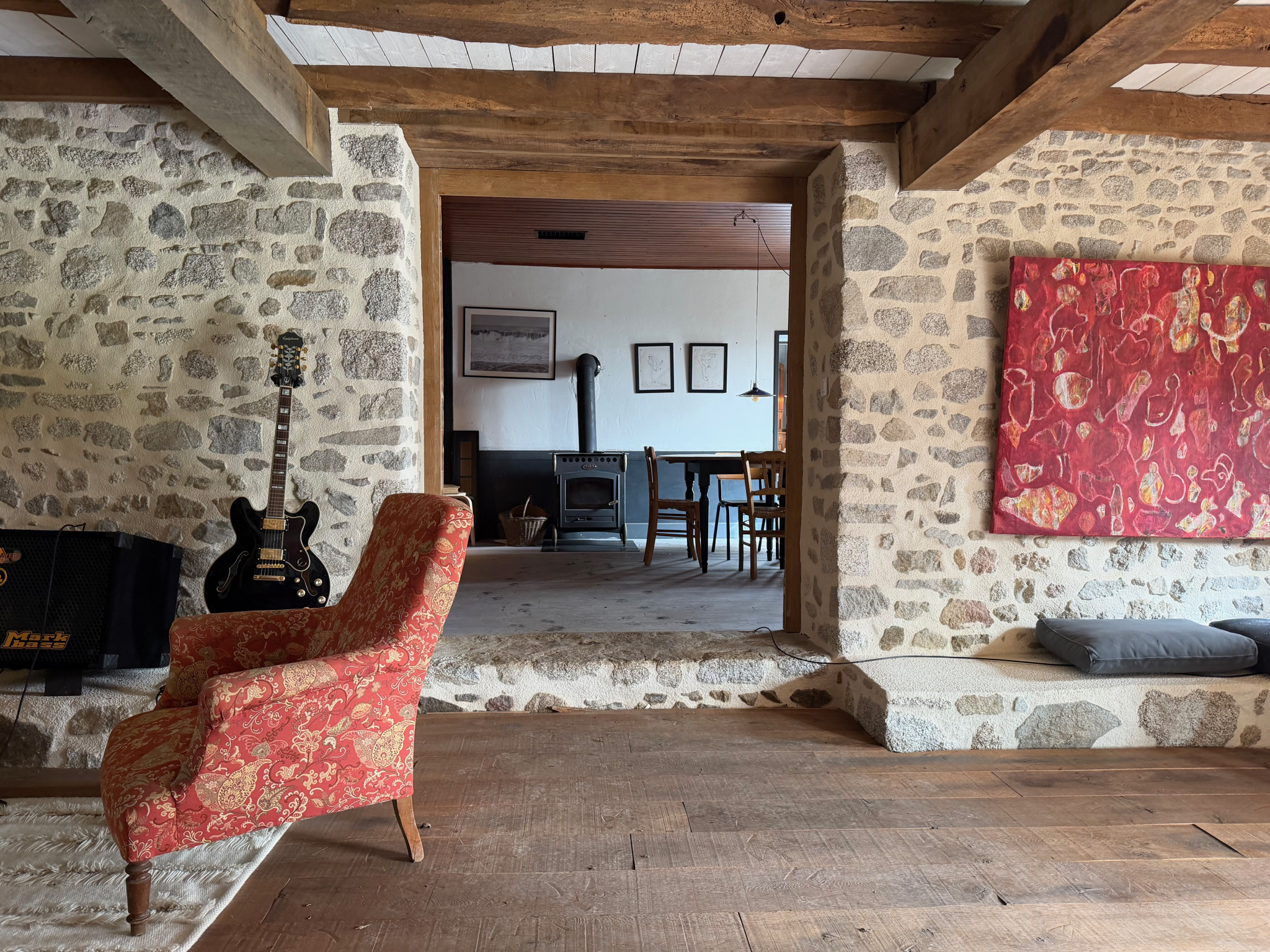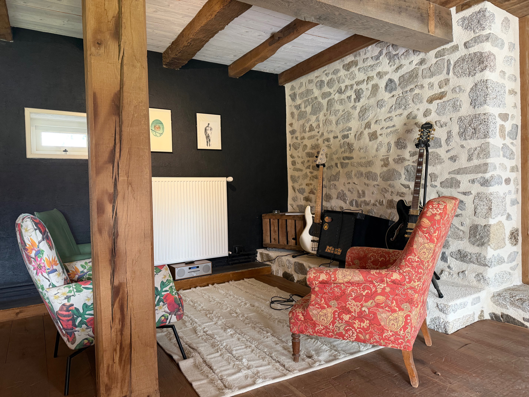 Auv 1215 : Maison en magnifiques pierres, dépendances et jardin.La maison a été entièrement rénovée avec beaucoup d’attention portée aux détails authentiques. Poutres apparentes, murs en pierres naturelles jontés, superbe plancher en bois dans le séjour, etc. La plupart des fenêtres sont en double vitrage, mais pas toutes.Toute la maison est équipée d’un chauffage central au fioul.Au milieu de la maison se trouve une superbe pièce de vie de 51m². C’est le cœur de la maison, avec un beau plancher en larges lames de chêne, un poêle à bois et des portes doubles donnant sur le jardin. Entre les poutres, la hauteur sous plafond est d’environ 2m50. Magnifique bibliothèque.La salle à manger fait 27m² et dispose également d’un poêle à bois, d’un parquet en chêne et d’un plafond habillé de bois.La cuisine équipée mesure 23m² et possède une belle ancienne cheminée ainsi qu’un poêle à bois, un sol carrelé et un plafond en bois peint en blanc. Derrière la cuisine se trouve un espace de rangement avec machine à laver et réfrigérateur, ainsi qu’un toilette supplémentaire.C’est également ici que se trouve l’accès à la cave de 28m² avec la cuve à fioul et la chaudière du chauffage central.Au rez-de-chaussée, il y a une première chambre de 13,5m² avec d’agréables portes doubles donnant sur le jardin. Plafond en bois, beaux planchers et salle de bains en suite. La magnifique salle de bains de 8m² comprend une douche à l’italienne, une baignoire en fonte sur pieds, un toilette et un beau meuble lavabo.Il y a également une pièce de 5m², idéale pour installer machine à laver et sèche-linge.Au premier étage se trouvent encore trois chambres agréables de 19,5, 12 et 9,5m². Il y a aussi une jolie salle d’eau (5m²) avec douche, toilette et lavabo.Il y a également un palier spacieux à l’étage de 12m², escalier compris. Cet étage est lui aussi chauffé par le chauffage central. Il y a encore un double grenier (surfaces au sol de 36 et 28m²) qui pourrait être aménagé. La toiture du grenier n’est pas isolée, mais le plancher entre le grenier et les chambres l’est.Le jardin est très joliment aménagé, avec une table pour manger et plusieurs coins salon agréables. On y trouve également de belles plantations. Le long de la façade, une pergola a été installée sous laquelle on peut s’asseoir.Il y a ensuite plusieurs dépendances attenantes. Tout d’abord un grand auvent d’environ 85m².Dans la continuité se trouve un espace de grange sous toit en pente de 46m² avec une toiture en moins bon état. À côté se trouve encore un petit auvent de 13m².Il y a aussi un abri en bois récemment construit de 32m². Il serait pratique d’y créer un passage afin de pouvoir entrer en voiture depuis le petit chemin situé à l’arrière.Sur le côté de la maison se trouve un magnifique mur en pierres naturelles avec un portillon piéton.Il y a également un grand espace de grange, accessible par la grande porte située à l’arrière du bâtiment, le long du petit chemin. Cet espace de grange ou d’atelier mesure environ 88,5m². Le point le plus haut du toit atteint 6,2 mètres.Très belle maison agréable.