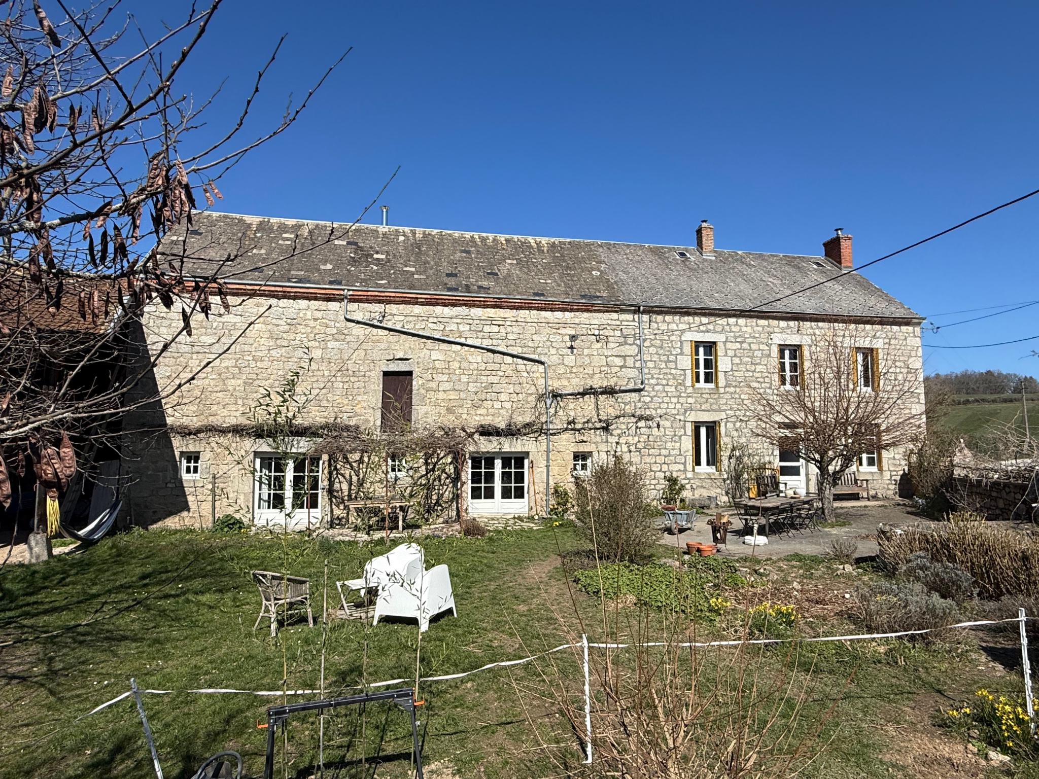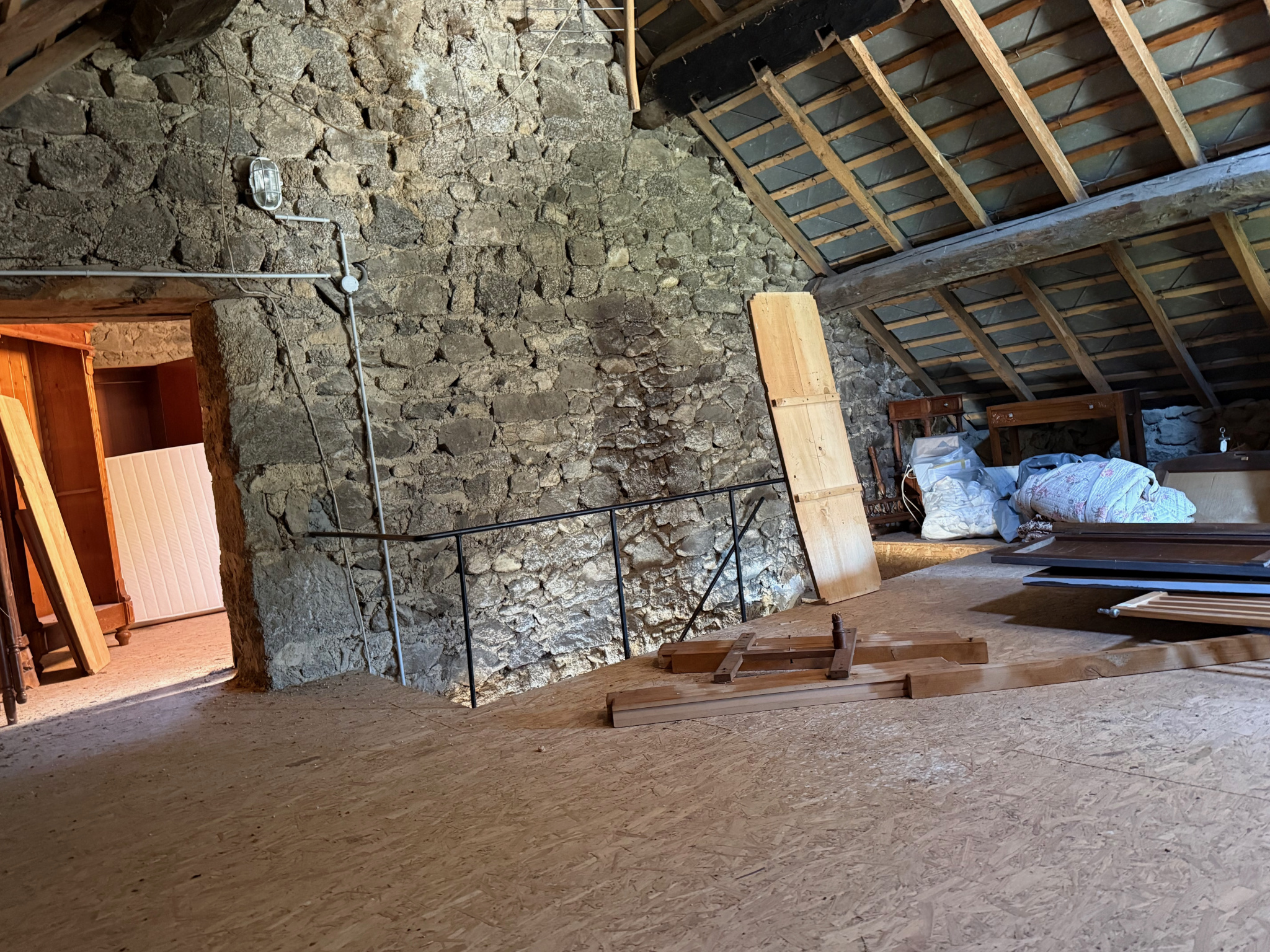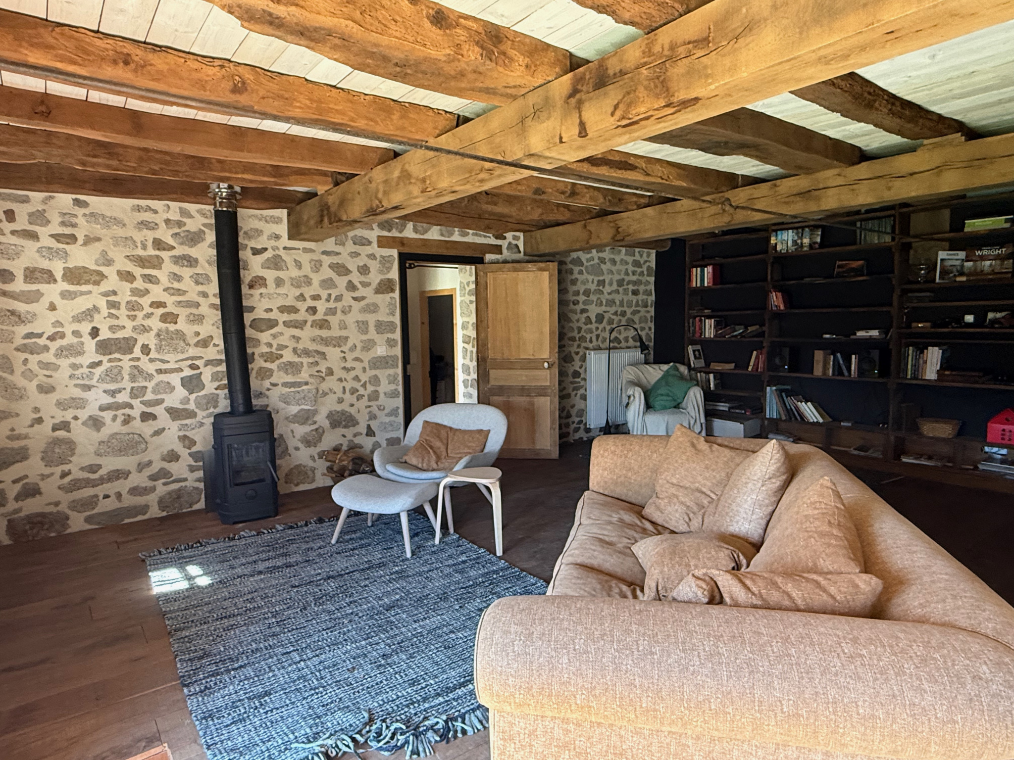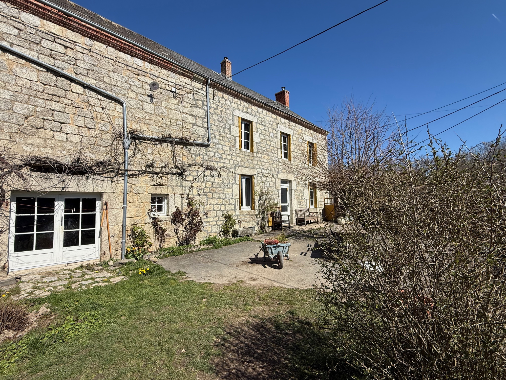 Auv 1215 : Plein-pied habitable, étage en plus, dépendances, beau jardin. Cette superbe maison en pierres taillées possède d’un rez-de-chaussée de plein-pied avec un étage avec 3 chambres et salle d’eau supplémentaires. Dépendances, terrain.La maison a été entièrement rénovée avec beaucoup d’attention portée aux détails authentiques. Poutres apparentes, murs en pierres naturelles jontés, superbe plancher en bois dans le séjour, etc. La plupart des fenêtres sont en double vitrage, mais pas toutes.Toute la maison est équipée d’un chauffage central au fioul.Au milieu de la maison se trouve une superbe pièce de vie de 51m². C’est le cœur de la maison, avec un beau plancher en larges lames de chêne, un poêle à bois et des portes doubles donnant sur le jardin. Entre les poutres, la hauteur sous plafond est d’environ 2m50. Magnifique bibliothèque.La salle à manger fait 27m² et dispose également d’un poêle à bois, d’un parquet en chêne et d’un plafond habillé de bois.La cuisine équipée mesure 23m² et possède une belle ancienne cheminée ainsi qu’un poêle à bois, un sol carrelé et un plafond en bois peint en blanc. Derrière la cuisine se trouve un espace de rangement avec machine à laver et réfrigérateur, ainsi qu’un toilette supplémentaire.C’est également ici que se trouve l’accès à la cave de 28m² avec la cuve à fioul et la chaudière du chauffage central.Au rez-de-chaussée, il y a une première chambre de 13,5m² avec d’agréables portes doubles donnant sur le jardin. Plafond en bois, beaux planchers et salle de bains en suite. La magnifique salle de bains de 8m² comprend une douche à l’italienne, une baignoire en fonte sur pieds, un toilette et un beau meuble lavabo.Il y a également une pièce de 5m², idéale pour installer machine à laver et sèche-linge.Au premier étage se trouvent encore trois chambres agréables de 19,5, 12 et 9,5m². Il y a aussi une jolie salle d’eau (5m²) avec douche, toilette et lavabo.Il y a également un palier spacieux à l’étage de 12m², escalier compris. Cet étage est lui aussi chauffé par le chauffage central. Il y a encore un double grenier (surfaces au sol de 36 et 28m²) qui pourrait être aménagé. La toiture du grenier n’est pas isolée, mais le plancher entre le grenier et les chambres l’est.Le jardin est très joliment aménagé, avec une table pour manger et plusieurs coins salon agréables. On y trouve également de belles plantations. Le long de la façade, une pergola a été installée sous laquelle on peut s’asseoir.Il y a ensuite plusieurs dépendances attenantes. Tout d’abord un grand auvent d’environ 85m².Dans la continuité se trouve un espace de grange sous toit en pente de 46m² avec une toiture en moins bon état. À côté se trouve encore un petit auvent de 13m².Il y a aussi un abri en bois récemment construit de 32m². Il serait pratique d’y créer un passage afin de pouvoir entrer en voiture depuis le petit chemin situé à l’arrière.Sur le côté de la maison se trouve un magnifique mur en pierres naturelles avec un portillon piéton.Il y a également un grand espace de grange avec sol surélévé, pour isolation des pièces dessou, accessible par la grande porte située à l’arrière du bâtiment, le long du petit chemin. Cet espace de grange ou d’atelier qui n'est pas adapté pour des véhicules mesure environ 88,5m². Le point le plus haut du toit atteint 6,2 mètres.Très belle maison agréable.
